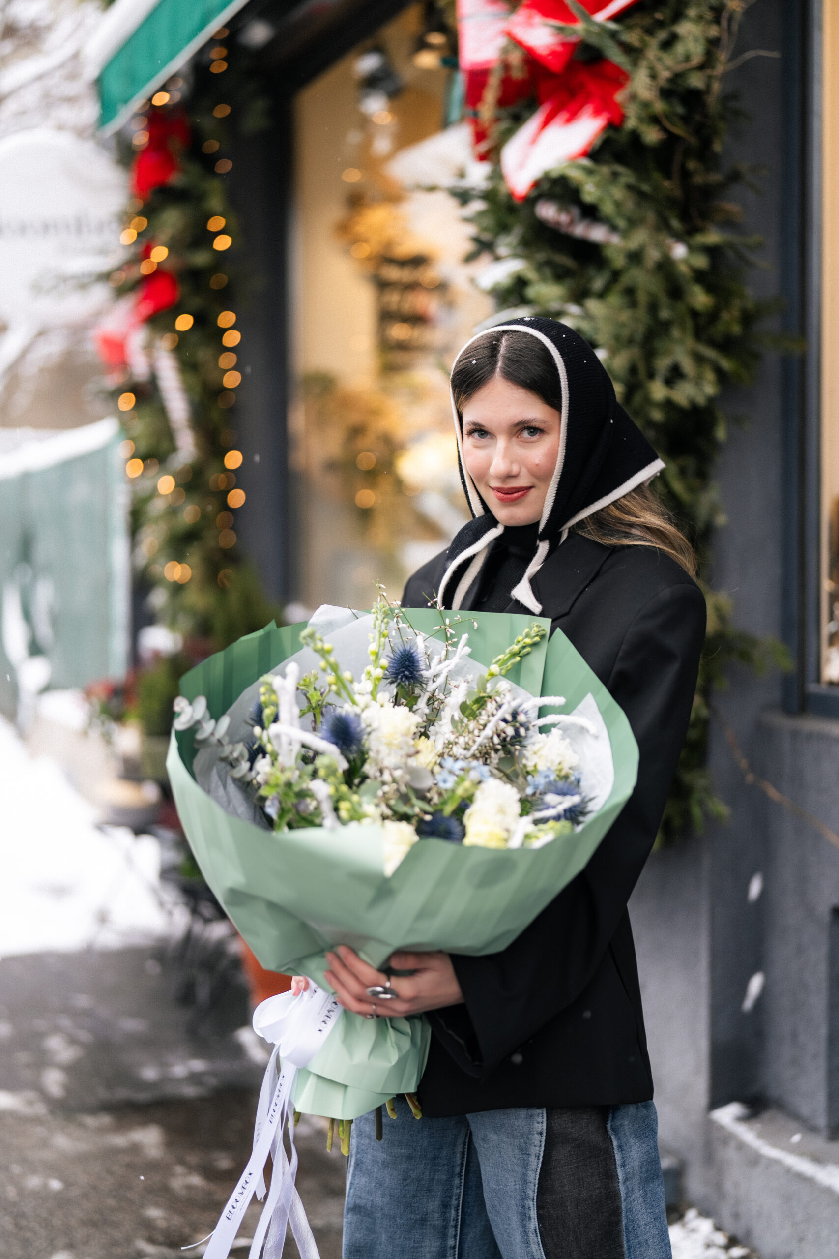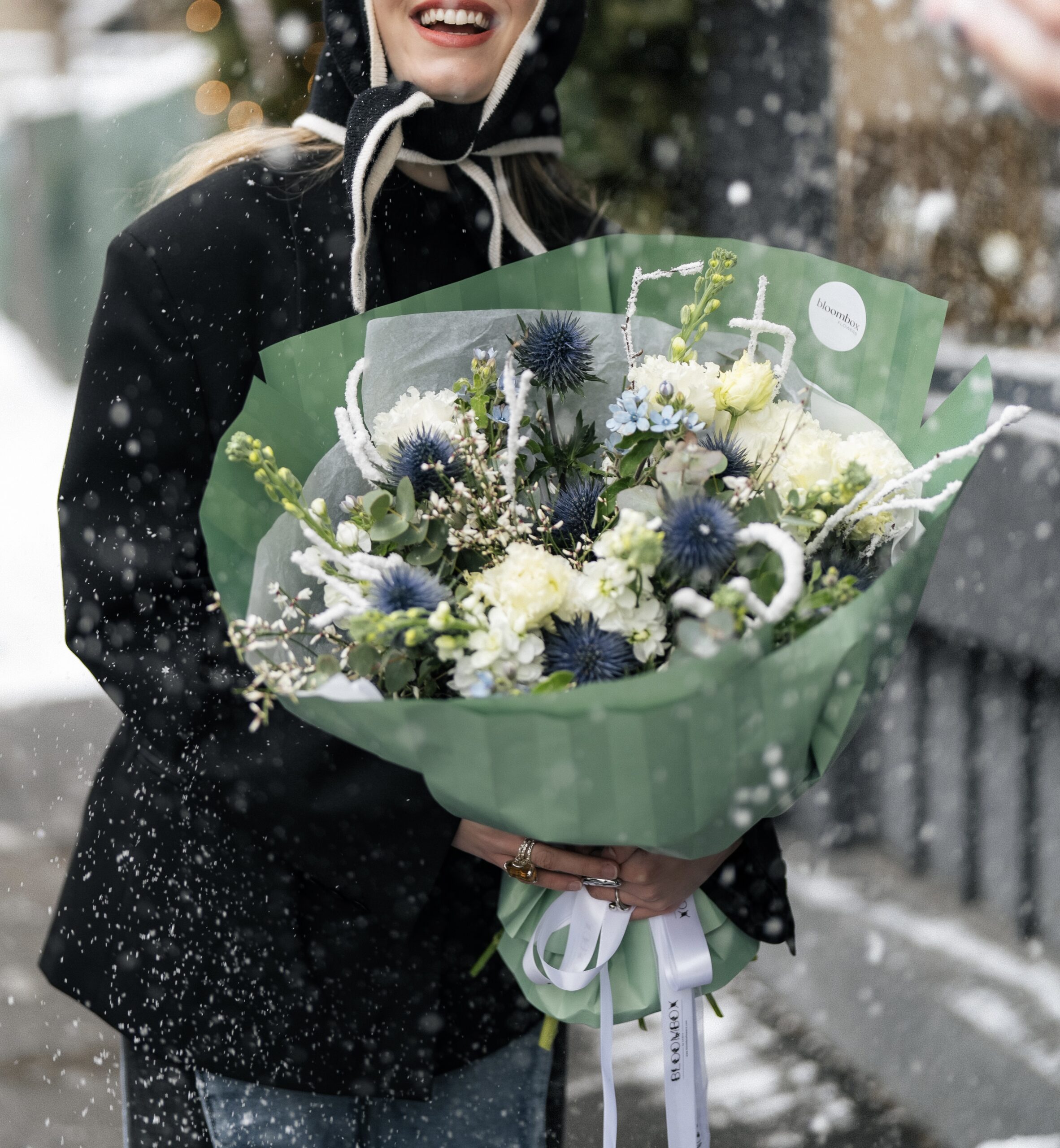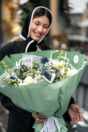 Un buchet proaspăt, elegant și luminos, creat ca o gură de aer curat în mijlocul zilei. Nuanțele de alb cremos se împletesc cu accente bleu și detalii albastre intense, într-o compoziție modernă, cu texturi fine și verdeață naturală. Este genul de buchet care arată impecabil în orice decor și transmite calm, rafinament și grijă.