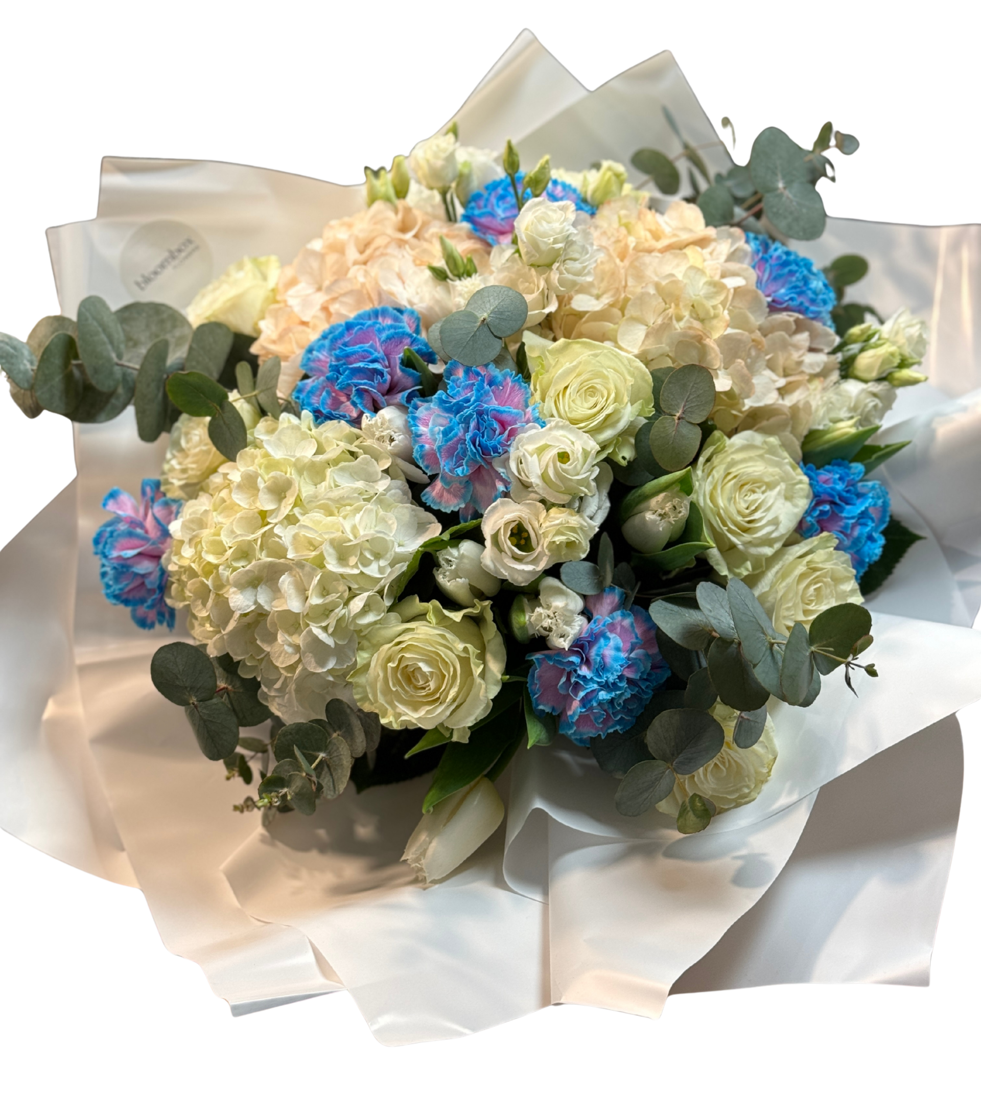 Un buchet elegant și neașteptat, în care nuanțele cremoase și ivory sunt puse în valoare de accente intense de albastru cobalt. Compoziția este bogată, modernă și foarte rafinată, cu volum dat de hortensii și detalii delicate de trandafiri, completate de eucalipt pentru un finish fresh și echilibrat.