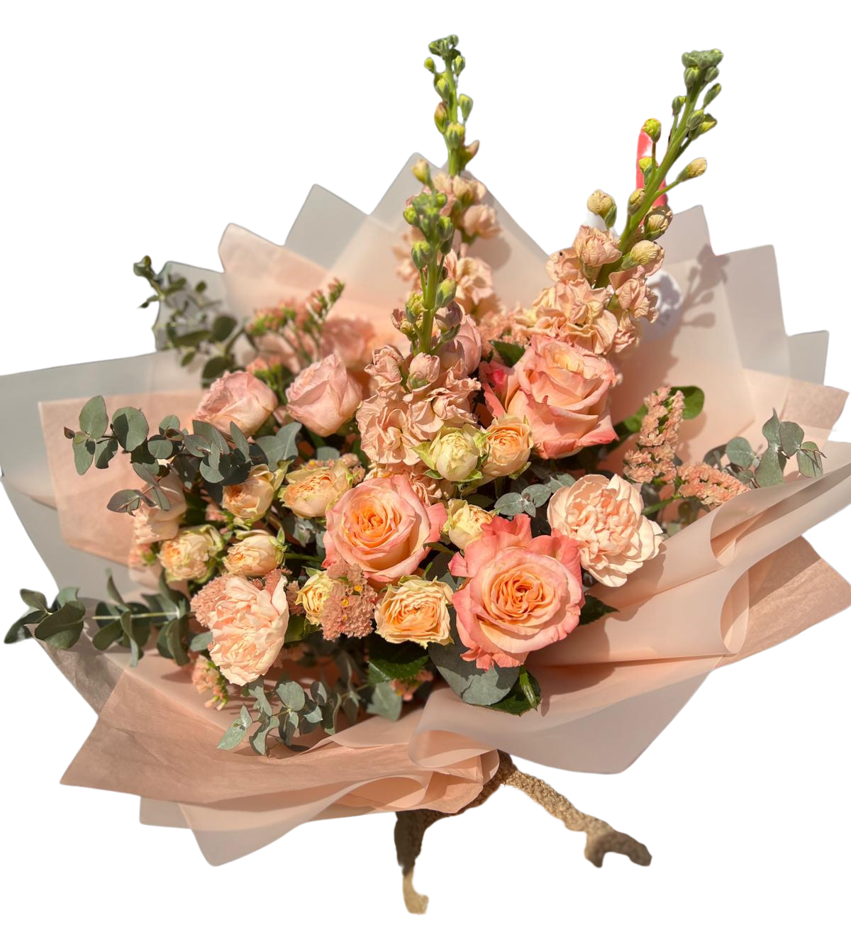 mix floral sezonier în nuanțe peach/nude (3 trandafiri, 2 spray roses și flori complementare – 3 matiola, 4 limonium, 3 garoafe)